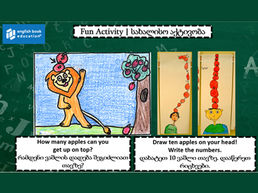 2. რამდენი ვაშლის დადება შეგიძლიათ თავზე? დახატეთ 10 ვაშლი თავზე. დააწერეთ რიცხვები.